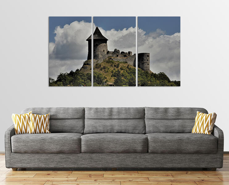 Somoskői vár 3 részes vászonkép/ Méret: 100cm X 55cm A magyar és szlovák határon Szlovákia területén elhelyezkedő Somoskői vár vászonkép formájában válik otthona díszévé! A vár északi oldalán találjuk a bazaltorgonát. A csaknem 500 méteres tengerszint feletti magasságban található somoskői várhegy északi oldalából kihajló, 8-9 méter hosszú, keskeny bazaltosz
