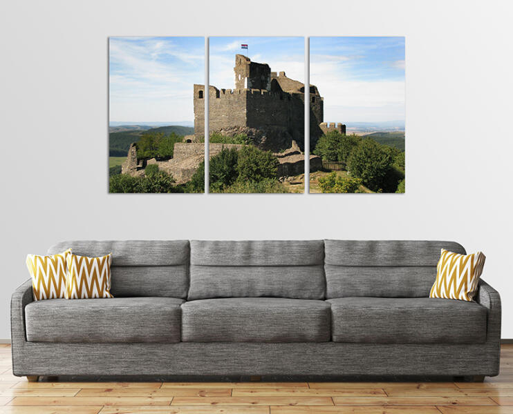 Hollókői vár 3 részes vászonkép/ Méret: 100cm X 55cm Népszerű turisztikai célpont az Ófalu feletti dombon magasodó vár Hollókői vár ötrészes falikép formájában költözik otthonába! A vár legendájából származik a falu neve is. Eszerint ugyanis élt valaha a környéken egy András nevű nagyúr, a híres Kacsics-família egyik tagja. András egyszer elrabolta valamelyik