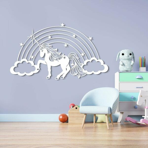 Gyönyörű egyszarvú falmatrica, amely egy eredeti lakberendezési kiegészítővé válik. Ez a falmatrica minden gyerekszobát otthonossá tesz. Nem szokványos papír matricáról van szó, hanem egy 3 mm vastag fa matricáról, amelynek köszönhetően a termék 3D hatást kelt a falon. A termék fő előnyei: Gyermek motívumú matrica Egyszerű fali rögzítés 3 mm vastag faanyag Széles