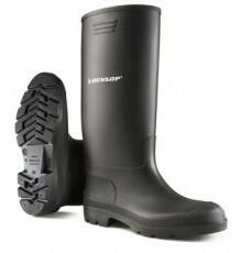Dunlop fekete színű tiszta PVC munkacsizma általános ipari és mezőgazdasági felhasználásra; ellenáll savaknak, lúgoknak, fertőtlenítőszereknek; alaktartó formai kialakítás, vastag, fröccsöntött, csúszásbiztos talp; -20 °C-ig használható, csizmabéléssel téliesíthető; széles, kényelmes szár-, lábfej- és orr-rész, könnyen felhúzható