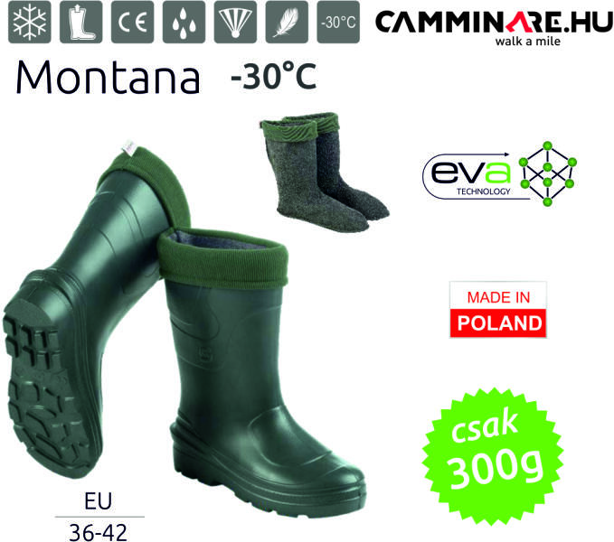 Pille könnyű, kiváló hőszigetelő képesség, különösen erős ellenálló anyag, EVA technológia, maximális hideg elleni védelem, csúszásmentes talp, 100%-os komfort érzet, vízálló. Kivehető és mosható bélés, bélés nélkül NYÁRON is használható. Rövid szárú kivitel.
