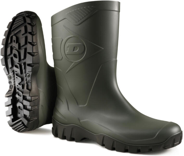 Dunlop fekete színű tiszta PVC munkacsizma általános ipari és mezőgazdasági felhasználásra; ellenáll savaknak, lúgoknak, fertőtlenítőszereknek; alaktartó formai kialakítás, vastag, fröccsöntött, csúszásbiztos talp; -20 °C-ig használható, csizmabéléssel téliesíthető; széles, kényelmes szár-, lábfej- és orr-rész, könnyen felhúzható