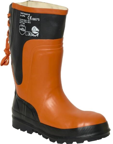 Biztonság: 3. osztály (28 m/sec. ) EN 345-1 1997, EN 345-2 1996 SB – E szabvány szerinti EK bevizsgálás 3. osztály, 2. kategóriás EVF, ellenáll 28 m/s-os láncsebességnek. KWF-tanúsítás. Anyagok: Gumikülső. Belül bélelt lélegző szövettel (pamutbélés). Talpbélés nedvszívó nemezből. Bokavédő megerősítés. Fényvisszaverő csíkok Acélbetét Kilyukadásgátló lemez.