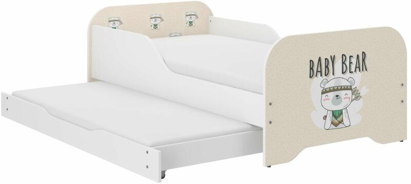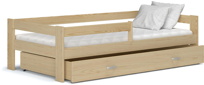 A kényelmes és stílusos gyerekágy leesésgátlóval tömör borovi fenyőből, 2x lakkozva szagtalan vizes bázisú lakkal. Az ágy részét képezi a rugalmas lamellás ágyrács, egy tágas kerekeken mozgatható ágyneműtartó és leesésgátló. A leesésgátlónak köszönhetően nem kell aggódnia, hogy gyermeke alvás közben megsérül. A korlát leszerelhető, jobb vagy bal oldalra is