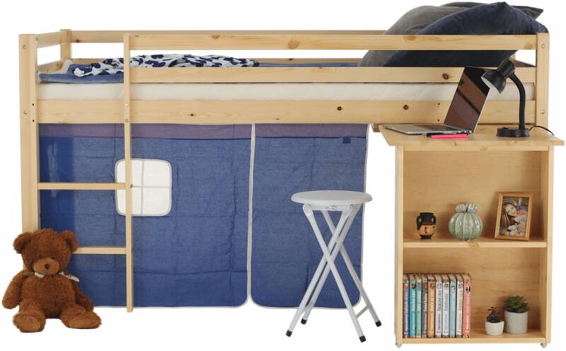 Ágy, emelt ággyal és PC asztallal ALZENA Anyag: fenyőfa/furnérlemez/pamut Szín: természetes/kék Méretek(SzéxMéxMa): 208x98x110 cm Asztal méretei (SzéxMéxMa): 60x80x75 cm Alvóhely mérete: 90x200 cm Íróasztal állvánnyal Univerzális létra Lécezett ágyrács furnérlemezből Matrac nélkül szállítva Szétszerelt állapotban szállítva