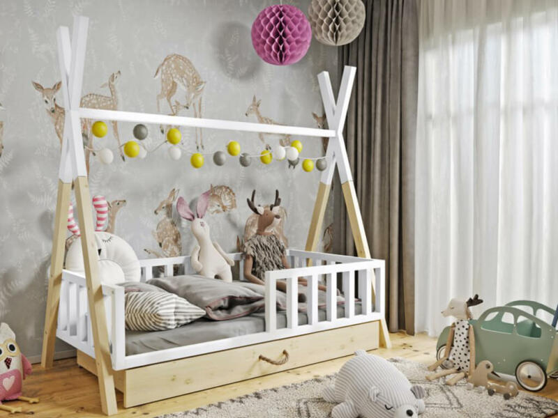 A Tipi házikó gyerekágy 80 x 180 cm minden gyerekszobába illik. Gyermeke imádni fogja az ágyat. Az ágy indián sátorra is emlékeztet, szép dekorációkkal díszíthető, így kellemes légkör alakítható ki a szobában. Az ágy része a leesésgátló, mely kétoldalas, jobbos vagy balos leesésgátlóként is használható. A házikó ágy borovi fenyőfából készül, három lakkré