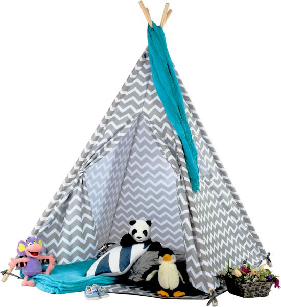 Gyereksátor ETENT Anyag: szövet/fenyőfa A szövet 100%-os poliészterből készült Színe: szürke/fehér/minta Méretek: 120x120x150 cm A szerkezet 4 támaszból áll Tipi gyerekeknek Vízálló alátéttel Az alátét hőszigetelő 3 éven felüli gyermekek számára ajánlott Alkalmas beltérbe és kültérre egyaránt Szállítás: szétszerelve
