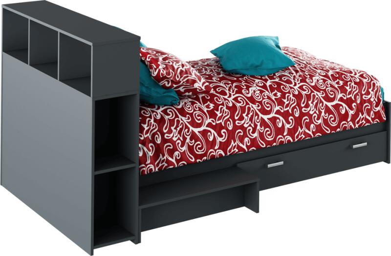 Ágy ALEXIA NEW Anyag: laminált DTD Szín: szürke/grafit Méretei (SzéxMéxMa): 120x230x110 cm Fekvőfelület: 90x200 Terhelhetőség: 120 kg Fiókkal Fejlécnél rakodótér Lépcsővel Ágyrács és matrac nélkül Minőségi szlovák termék Bontásban szállítva.