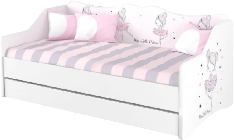 Lányos ágy 160x80 a Ballerina bútorkollekcióból. A bútor minőségi laminált deszkából (DTD) készül. A természetes anyagok felhasználásának köszönhetően 100%-ban ökológiai, biztonságos és egészségre nem káros. A 160x80 méretű gyerekágy színes nyomtatott mintája speciális laminálttal biztosított. Mosogatószerrel könnyen tisztítható. Tökéletesen illik a Balleri