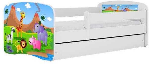 Babydreams fehér szafariágy fiókkal, latex matrac 140/70 A Babydreams ágy a gyermeki fantázia beteljesülése, mellyel mesebeli földre utazhatnak a kicsik. Az átgondolt megoldások és színválasztékok úgy lettek kialakítva, hogy korlátlanul serkentsék képzeletét. A korláttal ellátott egyszemélyes ágy kiváló minőségű 18 mm vastag bútorlapból készült. Több méretben és