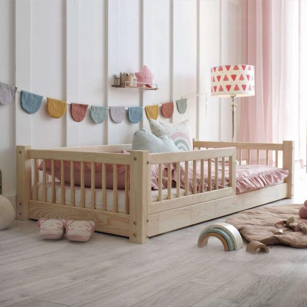 A Luloo Natúr Montessori 80x160 cm-es skandináv stílusú gyerekágy fenyő rétegelt lemezből készült. Az elemek simára csiszoltak és lekerekítettek. A natúr kivitel a kezeletlen nyersfa változatot jelenti. Az elülső leesésgátló rács levehető, mindkét oldalra (jobb-bal) rögzíthető. Figyelem! További lyukak láthatók az elülső ágykereten és a függőleges tartóelemeken.
