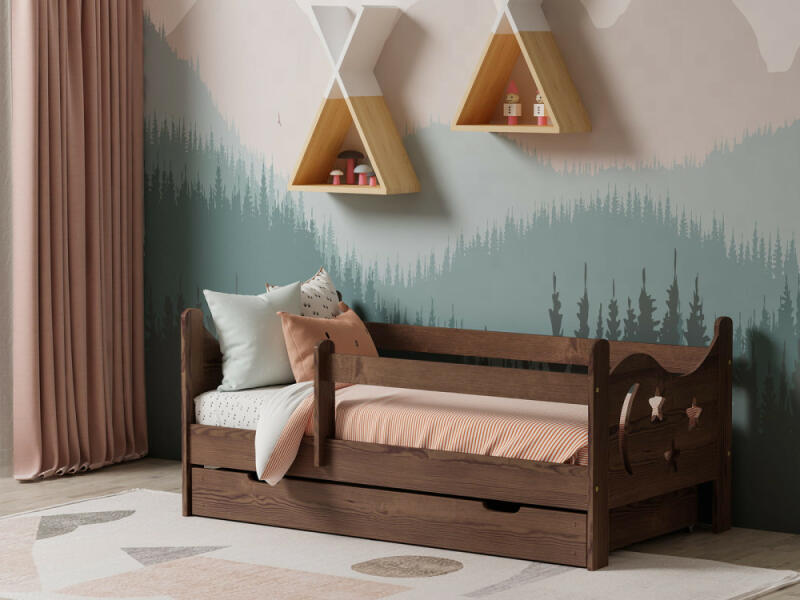A tölgy színre lakkozott OLGA 5 gyerekágy 90 x 200 cm ágyneműtartóval és leesésgátlóval kapható. Az ágy természetes, színtelen ökológiai, környezetre és egészségre nem ártalmas lakkal van lakkozva. A felhasznált anyagoknak köszönhetően az ágy minőségi és stabil, felnőtteknek is megfelelő. Az ágy ágyráccsal és ágyneműtartó tároló fiókokkal rendelkezik. A tá