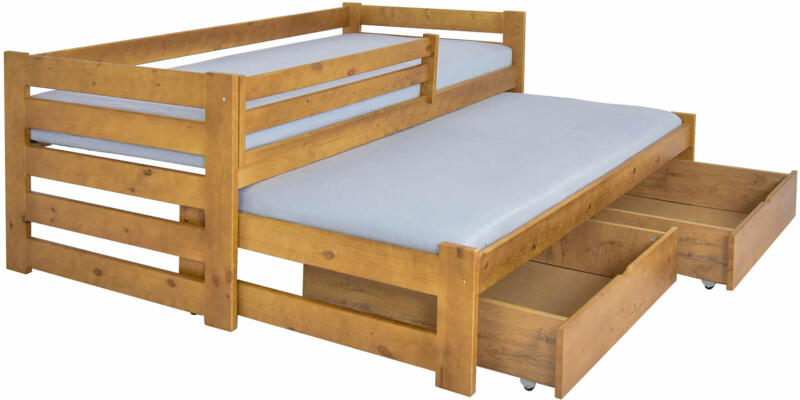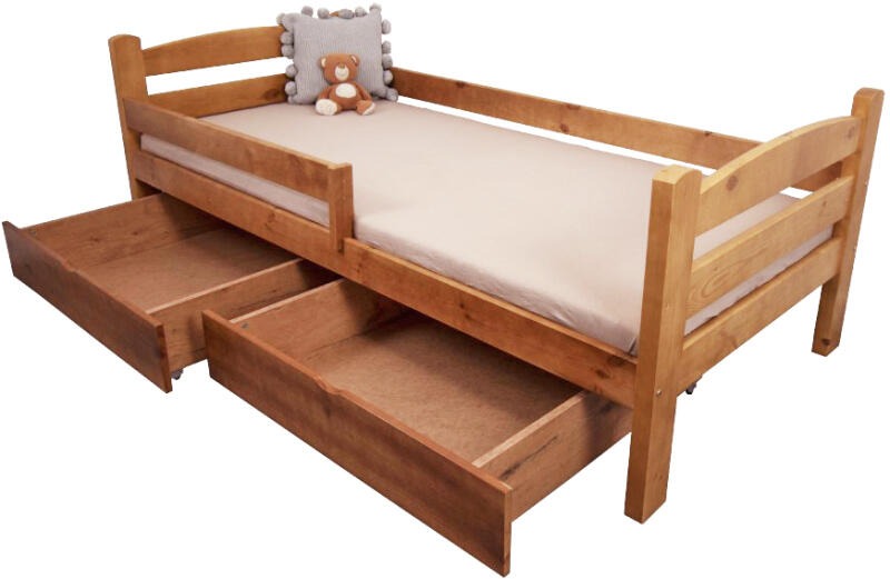 A VERONIKA 7 gyerekágy 200x90 cm kihúzható vendégággyal és ágyneműtartóval tömör borovi fenyőből, melynek köszönhetően nagyon stabil a szerkezete. Az ágy tökéletes választás a kisebb gyerekszobákba is. Az ágy tölgy színben kapható, 3x lakkozva természetre nem ártalmas ökológiai lakkal. Az ágy két tároló fiókkal is rendelkezik, amelyek műanyag kerekeken mozognak,