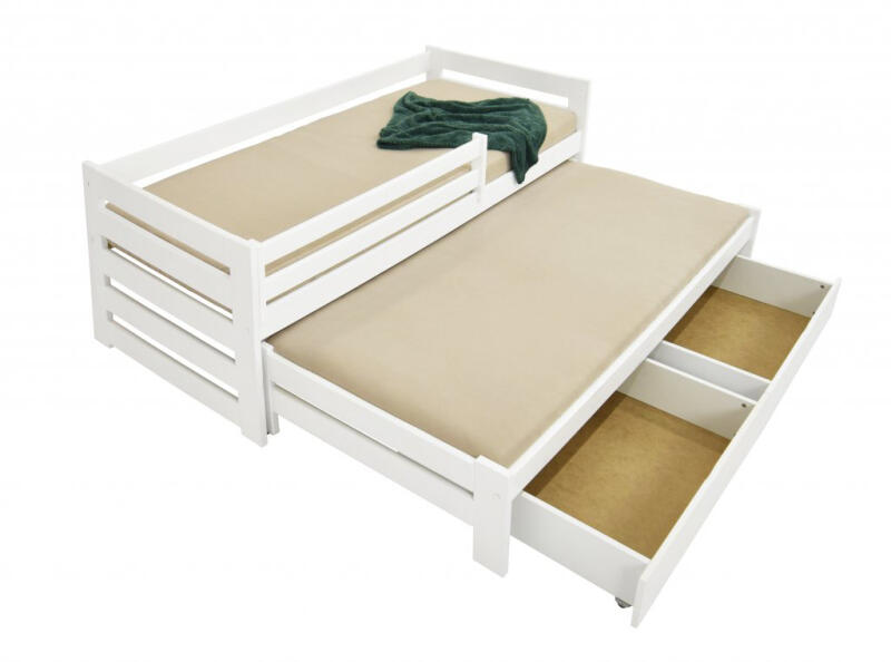 A VERONIKA 7 fehér gyerekágy 200x90 cm kihúzható vendégággyal és ágyneműtartóval tömör borovi fenyőből készült, melynek köszönhetően nagyon stabil a szerkezete. Az ágy tökéletes választás a kisebb gyerekszobákba is. Az ágy fehér színben kapható, 3x lakkozva természetre nem ártalmas ökológiai lakkal. Az ágy két tároló fiókkal is rendelkezik, amelyek műanyag ke