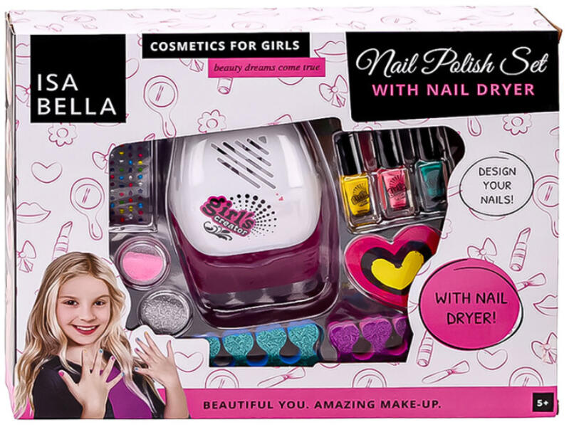 Készíts káprázatos körmöket saját körömstúdiódban! Az Isabella körömlakk szárító készlet minden eleme arra lett kifejlesztve, hogy bámulatos körmöket tudj varázsolni kezeidre és lábaidra. A játékban találsz 3 db különféle színű körömlakkot, így változatos színvariációkat tudsz felfesteni körmeid alapjaként. A száradó alkotásokra rászórhatod a csodálato