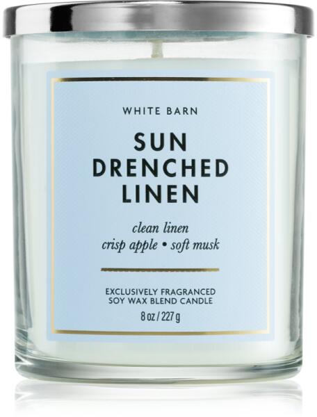 Bath & Body Works Sun-Drenched Linen, 227 g, Illatgyertyák Illatok lakásba, Az otthonát csodálatos aromával illatosító Bath & Body Works Caramel Pumpkin Swirl illatgyertya olyan meghitt hangulatot teremt, melynek köszönhetően mindig remekül érzi majd magát. Tulajdonságok: tiszta púderes illat Összetétel: szójaviasz tartalommal esszenciális olajokkal Használata: A mécse