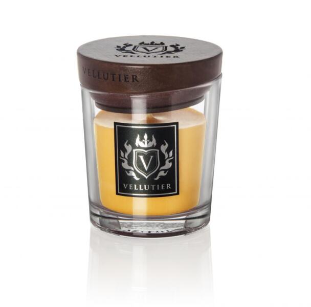Kicsi illatgyertya - Tropical Voyage 90 gA Vellutier gyertyák szinte igazi ékszerek - a legmagasabb minõséget rejtik magukban, különleges receptúrájú bársonyos viaszba rejtve és a márkánknak dedikált egyedi üvegbe csomagolva. Kifinomult formája, a jellegzetes két szögletű csiszolással, tökéletes alakot formál a pontosan illeszkedõ, valódi fából készült fedéllel. A fá