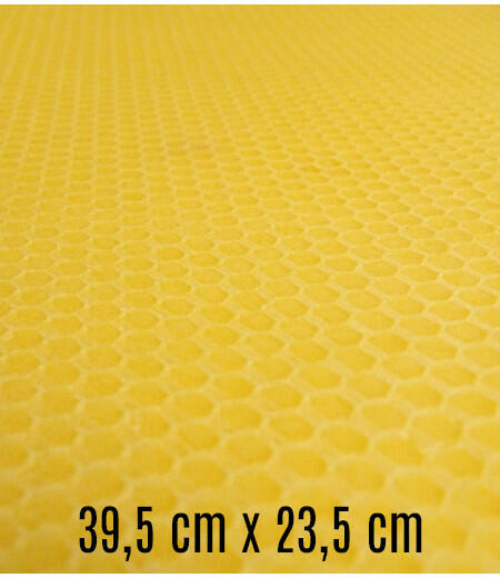 Hidegen hengerelt műlép fertőtlenített méhviaszból. Lapok mérete: 39,5 cm x 23,5 cm Lapok tömege: kb. 101g