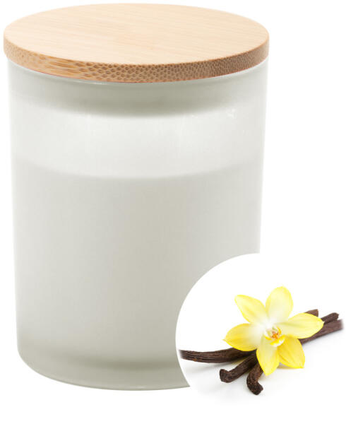 Növényi alapú illatgyertya homokfúvott üvegtartóban, bambusz tetővel. 200 gramm viaszt tartalmaz. Kraft papír dobozban szállítjuk.