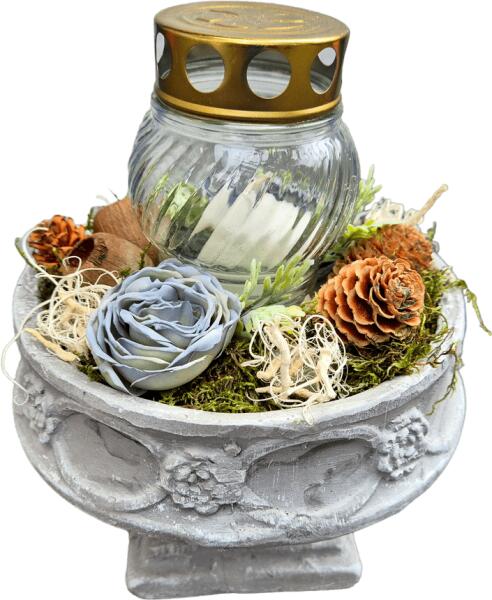 Kegyeleti Mécses / Kegyeleti Sírdísz Sírdísz, talpas gipsz kaspóban, fehér üveg mécses, és szárazvirág dekoráció Méret: 18 cm x 24 cm x 18 cm (A talpas gisz kaspó öntési technológiával készült, ezért felületi egyenletlenség/lyukacsosság előfordulhat) (Szállítás 990ft-tól) SÍRDÍSZ, MÉCSES, KEGYELETI DEKORÁCIÓ