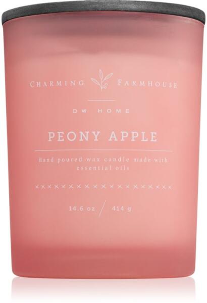 DW Home Charming Farmhouse Peony Apple, 413 g, Illatgyertyák Illatok lakásba, Az otthonát csodálatos aromával illatosító DW Home Charming Farmhouse Peony Apple illatgyertya olyan meghitt hangulatot teremt, melynek köszönhetően mindig remekül érzi majd magát. Összetétel: esszenciális olajokkal Használata: A mécsest kellően hőálló felületre helyezze. 4 óránál hosszabb ideig