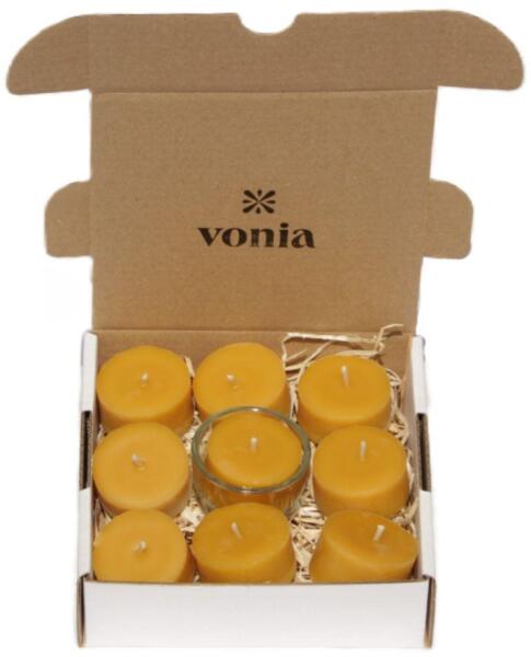 Illatos méhviaszból készült teamécsesek (9 db), zerowaste kivitelben és 1 db üveg mécsestartó. Kiváló ajándék barátok, tanárok vagy üzleti partnerek számára. Ideális olyan családok számára is, akik törekszenek a hulladékmentes életmódra. Megjegyzés: Kézzel készült termék, a viasz nincs vegyileg kezelve, ezért a gyertyák színe nem teljesen egységes, de ettől szá