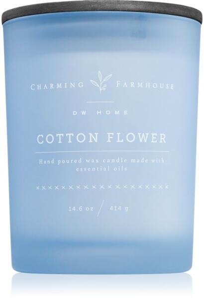 DW Home Charming Farmhouse Cotton Flower, 414 g, Illatgyertyák Illatok lakásba, Az otthonát csodálatos aromával illatosító DW Home Charming Farmhouse Cotton Flower illatgyertya olyan meghitt hangulatot teremt, melynek köszönhetően mindig remekül érzi majd magát. Tulajdonságok: tiszta púderes illat kézzel készített tiszta égés Összetétel: esszenciális olajokkal Használata: A