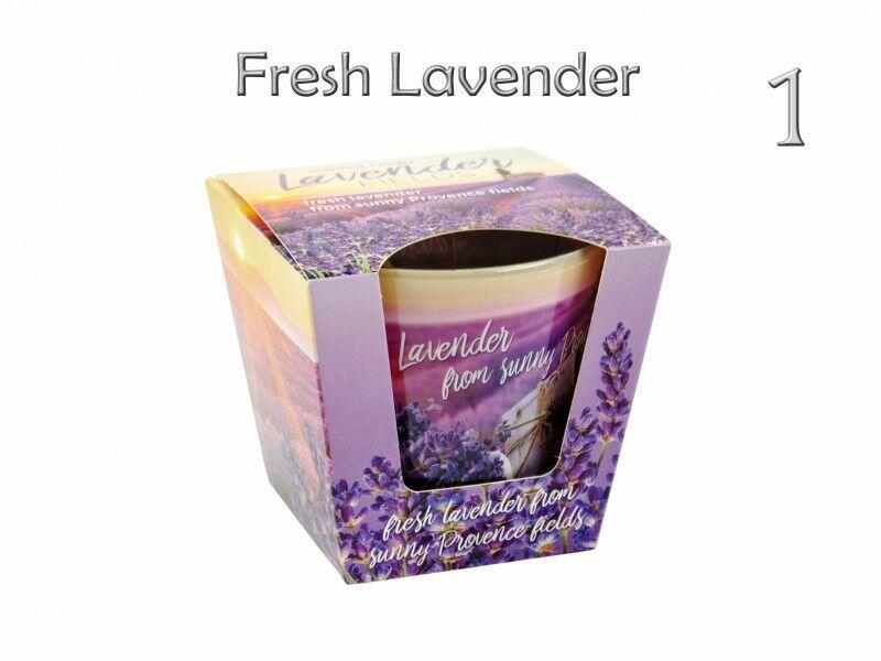 Illatgyertya pohárban Lavender 9cm 2féle típus Levendula illatú gyertya. Gyertya ü. poh. Lav. fields/soapBefoglaló méretek 9x9x9 cmAnyaga paraffin, üveg2 féle