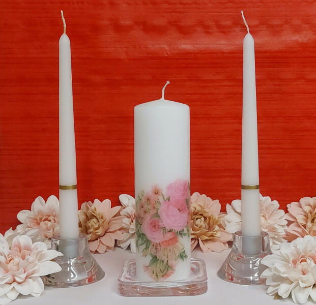 A polgári ceremónia egyik legszebb pillanata, amikor a menyasszony és a vőlegény eddigi életüket jelképező gyertyával meggyújtják a közös életüket szimbolizáló hengergyertya lángját. Az elkészítési idő 1-2 munkanap. A szett tartalma: 1 darab 6x20cm es hengergyertya 2 darab 2,2x26 cm-es kónusz gyertya. A szett ára tartalmazza a feliratozást. Ezt a gyertya részleteinél l