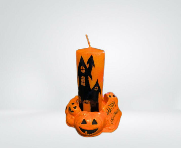Egyre nagyobb trendnek örvend a Halloween ünneplése. Az emberek világító tököt faragnak, ijesztő sminket készítenek maguknak és nem maradhat el a lakások, közösségi helyiségek dekorálása sem! Szettünk egy nagy tuskó gyertyát és egy gipszből készült gyertya tartót tartalmaz. Nagy tuskó gyertya méretei : 4,5 cm x 11,5 cm Gipsz gyertya tartó méretei: 11,5 cm x 4 cm