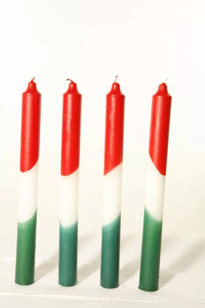 Paraffinból készült hosszúkás gyertya nemzeti színűre festve. Csomagba 4 db -ot teszünk. Megemlékezések kelléke lehet. cseppmentes égésű.
