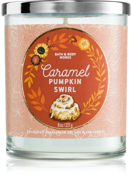 Bath & Body Works Caramel Pumpkin Swirl, 227 g, Illatgyertyák Illatok lakásba, Az otthonát csodálatos aromával illatosító Bath & Body Works Caramel Pumpkin Swirl illatgyertya olyan meghitt hangulatot teremt, melynek köszönhetően mindig remekül érzi majd magát. Tulajdonságok: édes aroma őszi illat Használata: A mécsest kellően hőálló felületre helyezze. 4 óránál ho