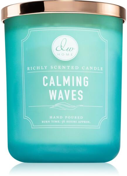 DW Home Signature Calming Waves, 428 g, Illatgyertyák Illatok lakásba, Az otthonát csodálatos aromával illatosító DW Home Signature Calming Waves illatgyertya olyan meghitt hangulatot teremt, melynek köszönhetően mindig remekül érzi majd magát. Összetétel: esszenciális olajokkal Használata: A mécsest kellően hőálló felületre helyezze. 4 óránál hosszabb ideig ne hagyja ég