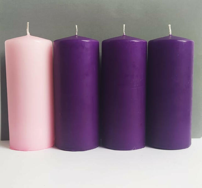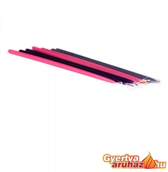 A hengergyertya paraffinból készült, vastag, hosszúkás henger formájú. A gyertya szett 4 db-ból áll, 3 db lila és 1 db rózsaszín. cseppmentesen ég.