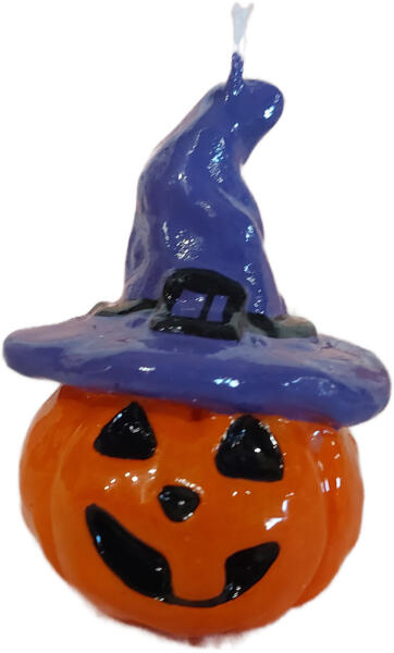 Dobd fel az ünnepi hangulatot ezzel a vidám Halloween gyertyával! A gyertya élénk narancssárga tököt ábrázol, amelyen egy lila boszorkánykalap trónol. A tök vigyorgó arca barátságos és mókás megjelenést kölcsönöz, így ideális dekoráció lehet Halloween-i partikhoz, gyerekeknek szánt eseményekhez, vagy akár otthoni dekorációként is. A boszorkánykalap részletes kial