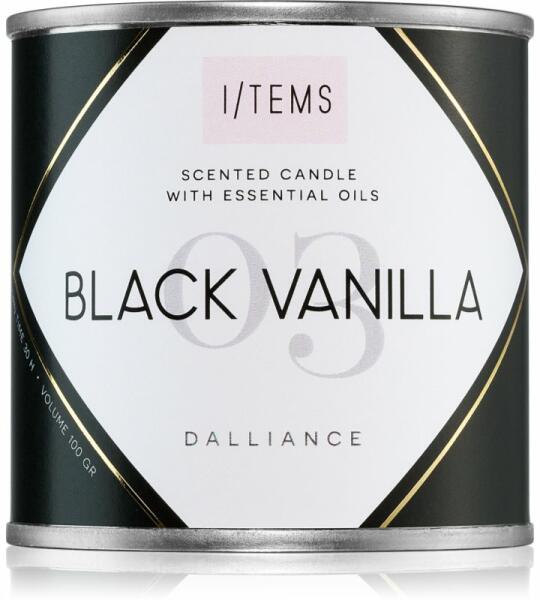 I/TEMS Essential 03 / Black Vanilla, 100 g, Illatgyertyák Illatok lakásba, Az otthonát csodálatos aromával illatosító I/TEMS Essential 03 / Black Vanilla illatgyertya olyan meghitt hangulatot teremt, melynek köszönhetően mindig remekül érzi majd magát. Tulajdonságok: édes aroma dizájnos csomagolás hosszú égési idő kézzel készített tiszta égés Összetétel: 100% szójavias