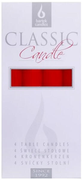 Bartek klasszikus asztali gyertya 4db - Piros Klasszikus asztali gyertya Piros színű Égési idő: 7 óra Anyaga: parafin Az égő gyertyát ne tegye gyúlékony anyag közelébe és soha ne hagyja őrizetlenül Kiszerelés: 4db