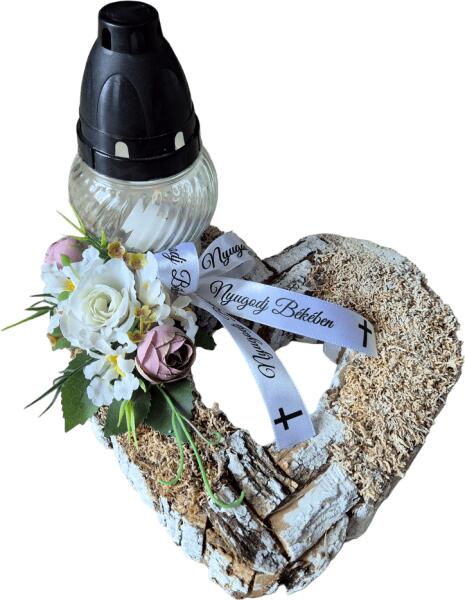 Kegyeleti mécses. Szív formájú, fakéreggel díszített kegyeleti mécses, fehér üveges mécsessel, mohával és selyemvirággal díszítve. Méretek: 23cm x 22cm x 16cm Eltávozott szeretteink nyughelyére, emlékhelyére.