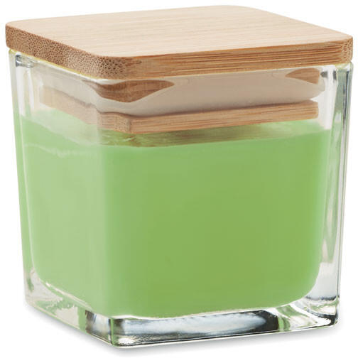 Négyzet alakú illatgyertya 50g Illatosított növényi alapú viaszgyertya szögletes üvegtartóban, bambuszfedéllel. 50 g. Égési idő: 8 óra. Aroma: fehér (06) vanília, sárga (08) citrom, narancs (10) narancs, zöld (48) alma.
