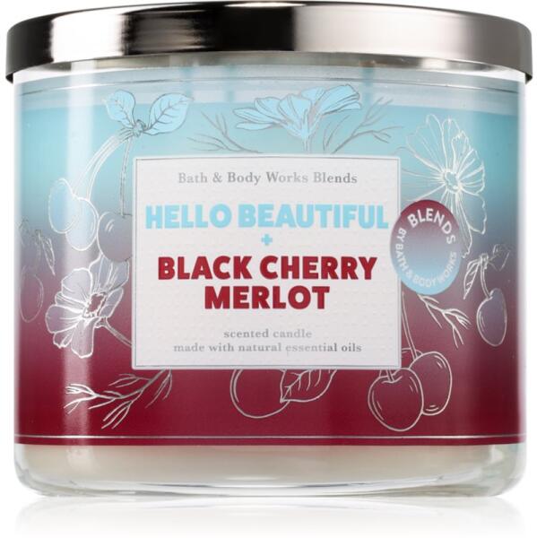 Bath & Body Works Hello Beautiful + Black Cherry Merlot, 411 g, Illatgyertyák Illatok lakásba, Az otthonát csodálatos aromával illatosító Bath & Body Works Hello Beautiful + Black Cherry Merlot illatgyertya olyan meghitt hangulatot teremt, melynek köszönhetően mindig remekül érzi majd magát. Tulajdonságok: virágos illat gyümölcsös illat Összetétel: esszenciális olajokk