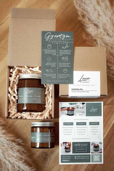 Ezeket a szójagyertyákat üvegben kínáljuk, mely alkalmas ismételt használatra, parafa dugóval és természetes papír etikettel, mely juta zsinórral van rögzítve a gyertyához. A szójaviasz fő előnye az, hogy kiválóan tárolja az illatot és fokozatosan szabadítja fel azt égés közben. A szójagyertyák tisztábban, hidegebben égnek, mint a parafin gyertyák, élettartamuk hoss