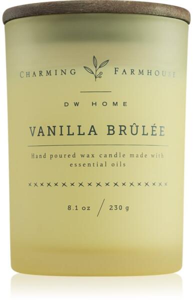 DW Home Charming Farmhouse Vanilla Brűlée, 230 g, Illatgyertyák Illatok lakásba, Az otthonát csodálatos aromával illatosító DW Home Charming Farmhouse Vanilla Brűlée illatgyertya olyan meghitt hangulatot teremt, melynek köszönhetően mindig remekül érzi majd magát. Tulajdonságok: édes aroma gourmand illat kézzel készített Összetétel: esszenciális olajokkal Használata: A m
