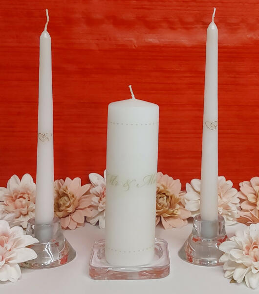 A polgári ceremónia egyik legszebb pillanata, amikor a menyasszony és a vőlegény eddigi életüket jelképező gyertyával meggyújtják a közös életüket szimbolizáló hengergyertya lángját. A gyertyán már meglévő felirat szövege "Mr & Mrs". Ez nem levehető, a díszítés része. Az elkészítési idő 1-2 munkanap. A szett tartalma: 1 darab 6x20cm es hengergyertya 2 darab 2,