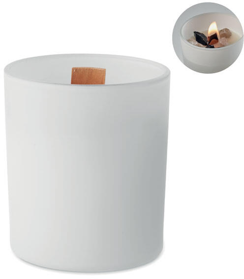 Növényi viaszgyertya 200 g Vanília illatú növényi alapú viaszgyertya üvegben, kövekkel és fa kanóccal. 200 g. Égési idő: 20 óra.