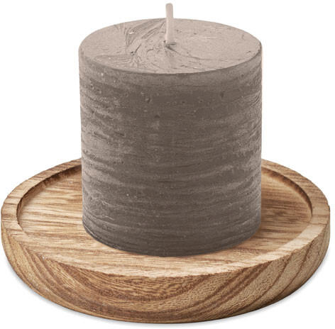 Gyertya kerek fa talpon 88gr Kerek formájú, fából készült dekoratív tartó vanília illatú gyertyával.