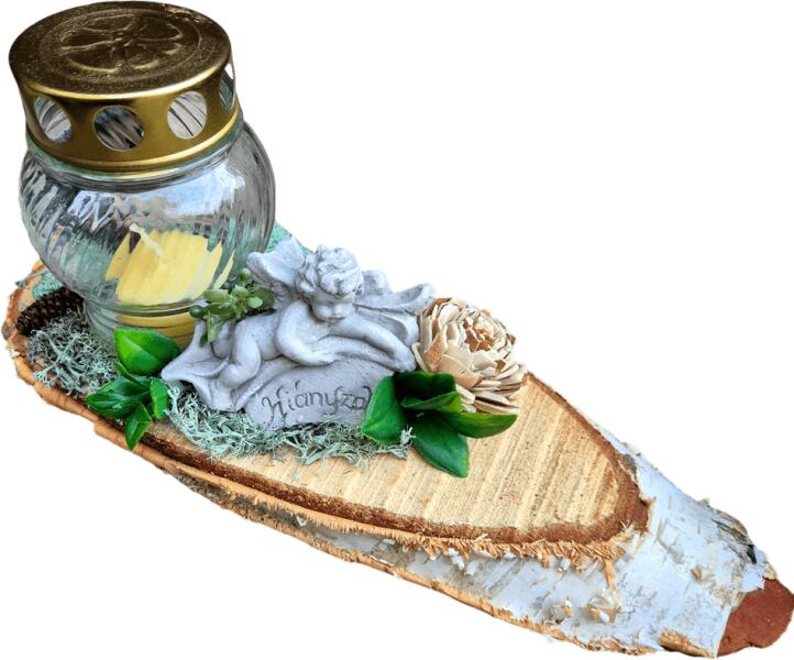 Fatalpas Mécses Sírdísz, üveg mécses fa talpon, hiányzol feliratú angyalkás szobrocskával, és száraz díszekkel. Méret: 24 cm x 10 cm x 13 cm (a méretek minimálisan eltérhetnek, a fatalpak eltérései miatt) (Szállítás 990ft-tól) sírdísz, kegyeleti dekoráció, mécses