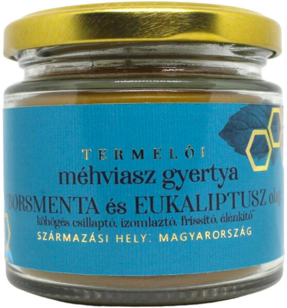 Kézműves termelői méhviasz gyertya 100% esszenciális borsmenta és eukaliptusz illóolajjal. Népi gyógyászat szerint: Köhögéscsillapító, izomlazító, légútfrissítő, élénkítő.
