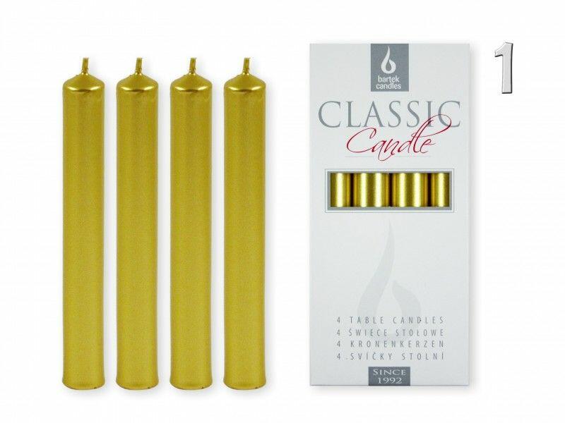 Szál gyertya metál 4db 2x17cm 5féle - Szálgyertya 5féle típus választhatóBefoglaló méretek 8.5x2x18 cmAnyaga paraffin