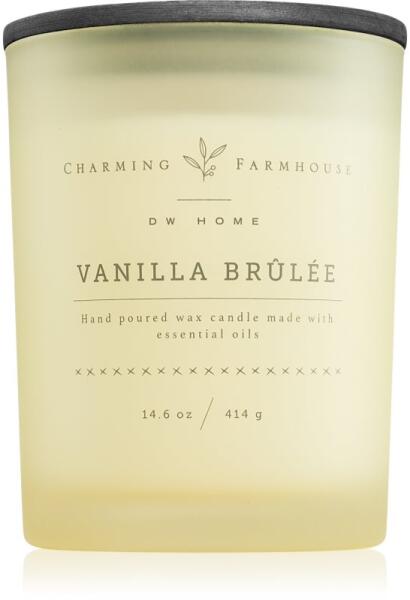 DW Home Charming Farmhouse Vanilla Brűlée, 414 g, Illatgyertyák Illatok lakásba, Az otthonát csodálatos aromával illatosító DW Home Charming Farmhouse Vanilla Brűlée illatgyertya olyan meghitt hangulatot teremt, melynek köszönhetően mindig remekül érzi majd magát. Tulajdonságok: édes aroma gourmand illat kézzel készített Összetétel: esszenciális olajokkal Használata: A m