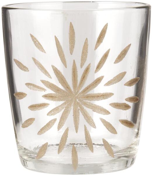 Figyelem, gyertyák szerelmesei! Tegye különlegessé a borongós napokat kedvenc illataival. Gyújtson meg egy fahéj vagy erdő illatú gyertyát ebben az elegáns, sárgaréz díszítésű üveg gyertyatartóban, amely egyedi fényhatásokkal varázsolja el otthonát. A gyertyatartó külső felületét dekoratív mintázat borítja, amely finoman átszűri a gyertya meleg fényét, romantikus